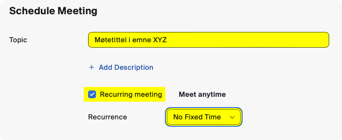 - Like nedenfor skal vi nå sette en hake foran valget Recurring meeting, og i den tilhørende nedtrekksmenyen velger vi No fixed time. På denne måten har vi nå laget en møtelenke som kan brukes når som helst, uten at vi her og nå trenger å spesifisere tidspunkt for møtene vi skal ha gjennom semesteret.