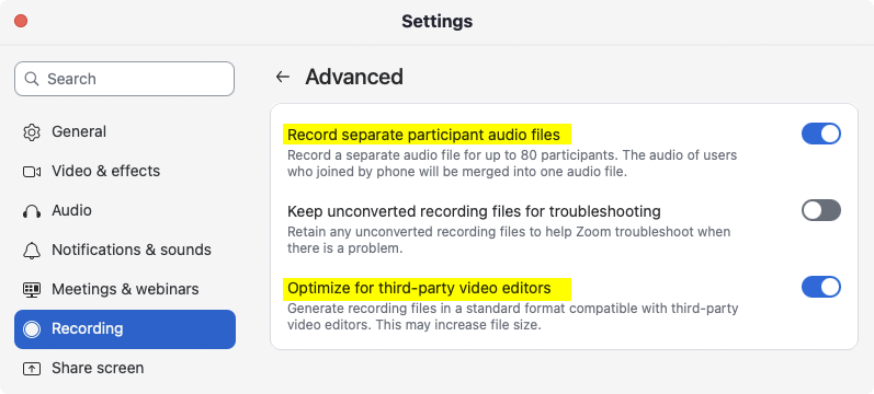- Akkurat dette punktet utføres kun av personen som skal gjøre selve opptaket: Fra hjemskjermen i Zoom, klikk på tannhjulet øverst til høyre (Settings) og velg Recording i menyen til venstre. Klikk på knappen Advanced nederst, og sørg for at du haker av for Record a separate audio file of each participant samt Optimize for third-party video editors.