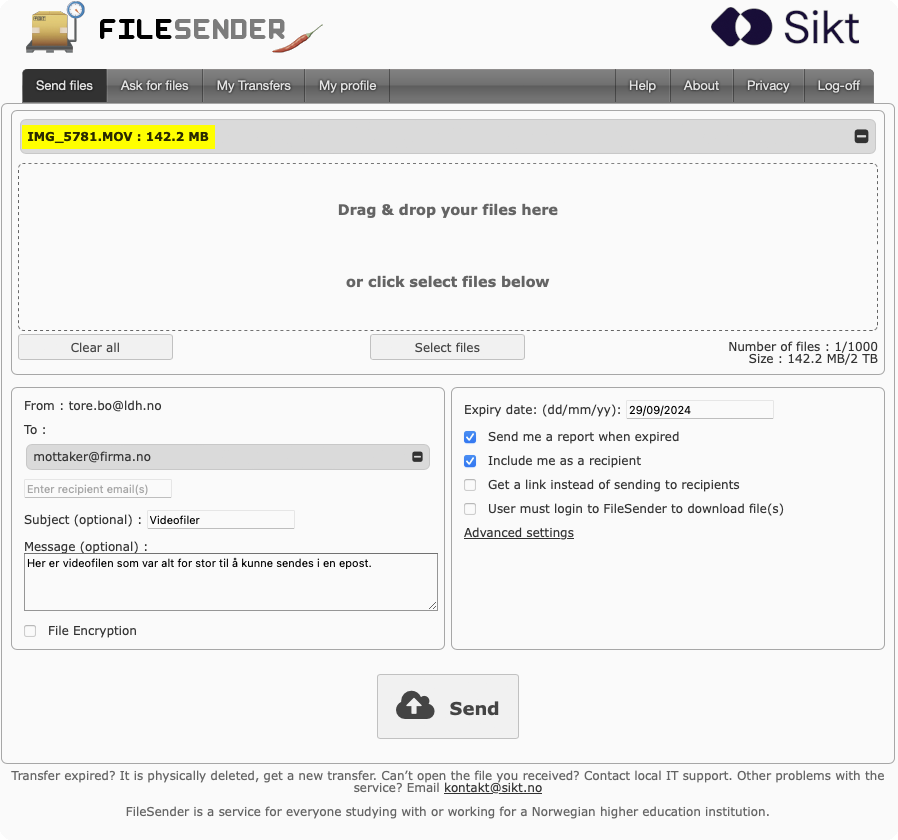 Du kan sende store filer med SIKTs FileSender. Den er helt selvforklarende, og du logger inn med Feide. Skulle du likevel ha behov for bruksanvisning, er hele prosessen grundig forklart om du trykker på Help helt øverst.